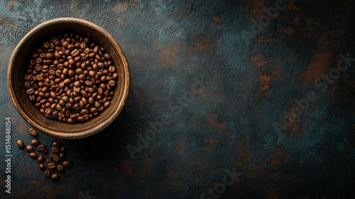 Close-up of a rustic bowl filled with roasted coffee beans placed on a dark textured surface for aromatic fresh coffee brewing and craft beverage preparation