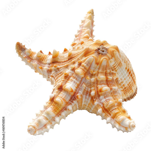 Close-up of a seashell, light beige and tan, with intricate patterns and star-like projections