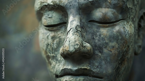 Closeup of a serene stone sculpture face evoking tranquility and timelessness in artistry and nature