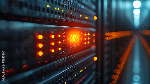 Close-up of a server rack with neatly organized cables and blinking LED indicators in a high-tech data center, with more server racks in the background.