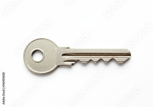 Close-up of a single metal door key with a circular head and jagged edge on a white background