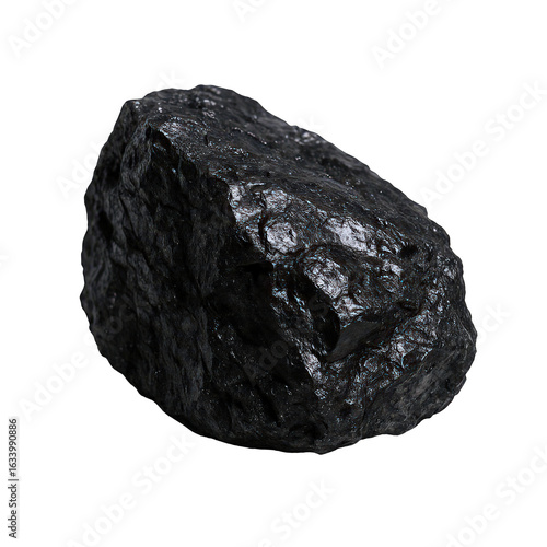 Close-up of a single piece of rough, black coal, showcasing its textured surface and reflective qualities against a dark backdrop.