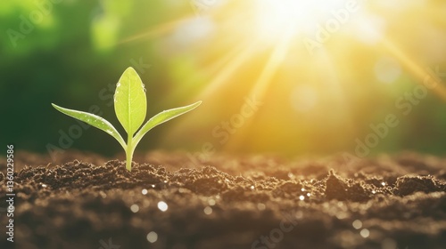 Close-up of a single sprouting seed in fertile soil, surrounded by dew drops, morning light, symbolizing growth and renewal