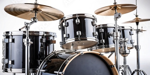 Close-up of a sleek black drum set on a white background, highlighting the contrasting textures and tones of the instrument's hardware and skin.