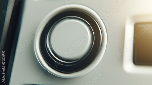 Closeup of a sleek, circular button with a metallic finish. Perfect for tech, industrial, or automotive design projects needing a modern, minimalist aesthetic.