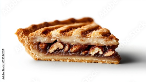 Close-up of a slice of pecan pie. the pie has a golden brown crust on top and a layer of caramel sauce on the bottom.