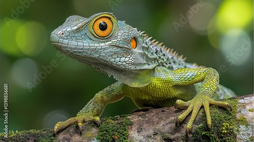 Close-up of a small lizard, vibrant green and light blue scales, large orange eyes, perched on a mossy tree branch in a lush, out-of-focus forest backdrop