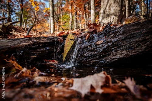 Close-up of a small stream flowing over fallen leaves and logs in an autumn forest.