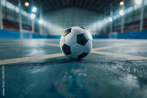 Close-up of a soccer ball on an indoor court with blurred background lighting
