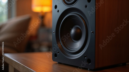 Close-up of a speaker on a wooden table