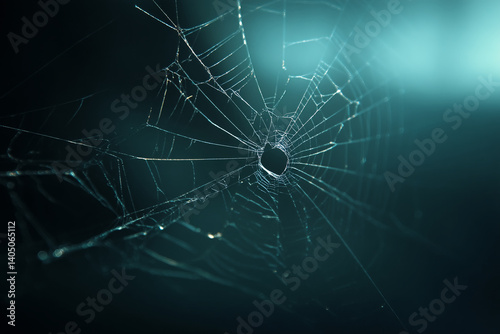 Close-up of a spiderweb, delicate threads against a dark teal background, showcasing intricate natural structure, symbolizing fragility, patience, and the cycle of life. Free space