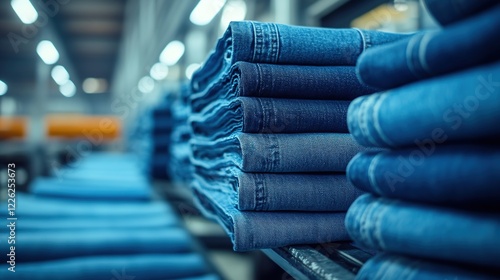 Close-up of a stack of newly produced jeans in a factory