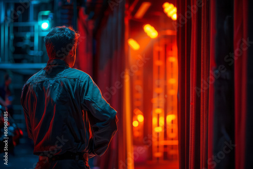 Close-up of a stagehand adjusting the curtains, with the glow of the stage lights in the background,