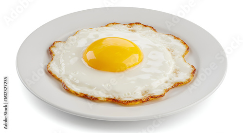 Close-up of a sunny side up egg served on a white plate. Perfectly cooked yolk and crispy edges. Simple and delicious breakfast.