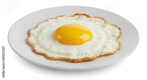 Close-up of a sunny side up egg served on a white plate. Perfectly cooked yolk and crispy edges. Simple and delicious breakfast.