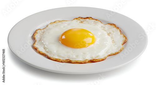 Close-up of a sunny side up egg served on a white plate. Perfectly cooked yolk and crispy edges. Simple and delicious breakfast.