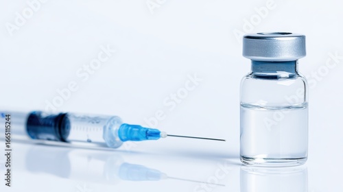 Close-up of a syringe and vial containing a clear liquid, set against a minimalist background for medical use