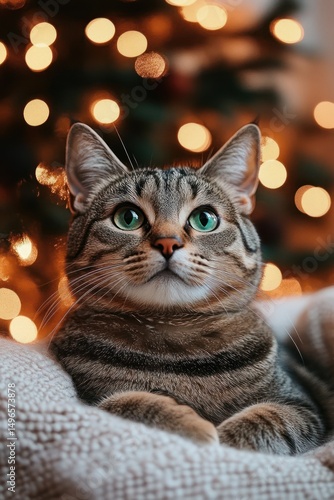 close-up of a tabby cat with green eyes resting on a cozy knitted blanket with out-of-focus warm glowing lights in the background creating a calm and serene atmosphere