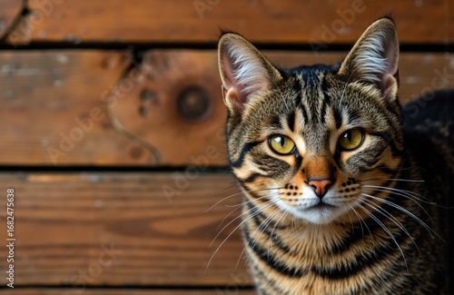 Close-up of a tabby cat with yellow eyes and distinctive striped fur sitting in front of a wooden wall