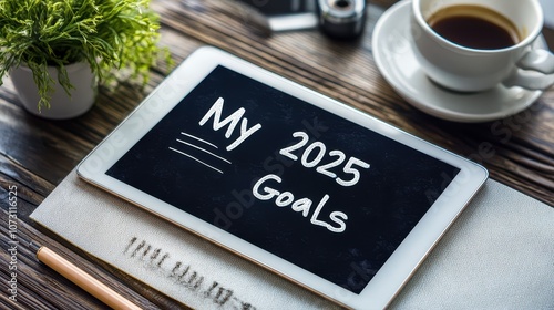 Close-Up of a Tablet Displaying Personal Goals with a Cup of Coffee and Green Plant on a Wooden Table, Ideal for Productivity and Planning Inspiration