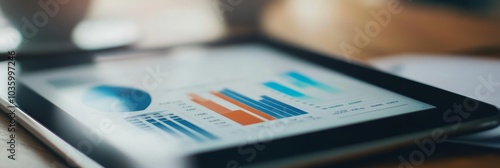 Close-up of a tablet screen displaying graphs and charts, illustrating financial data analysis, business strategy, data visualization, financial planning, and digital technology.