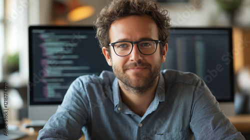 Close-up of a tech startup founder wearing a casual button-down shirt, hands resting on a desk, with a laptop and coding screens behind him.