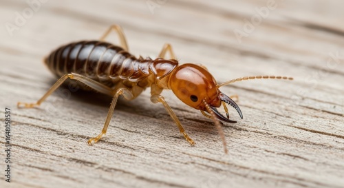 Close-up of a termite on wooden surface with detailed segmented body and antennae
