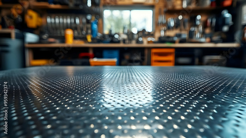 Close-up of a textured metal surface with a blurred background of a workshop.