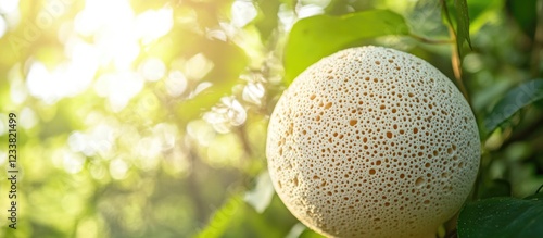 Close-up of a textured round gourd hanging on a green vine with soft sunlight filtering through foliage Copy Space