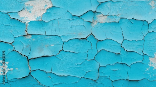 Close-up of a textured surface with cracks and peeling paint. the paint is a bright turquoise color and the cracks are jagged and uneven.