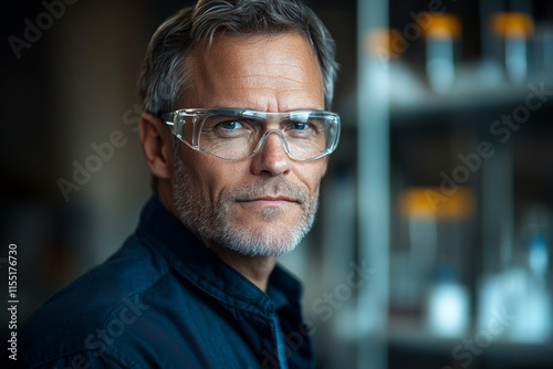 Close-up of a thoughtful man with safety glasses in a laboratory setting.