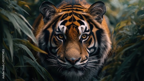 Close-up of a Tiger's Face Hidden in Lush Greenery