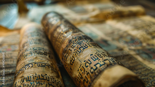 Close-up of a torah scroll with abstract, detailed script and illuminated letters