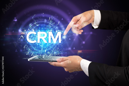 Close-up of a touchscreen with CRM abbreviation, modern technology concept