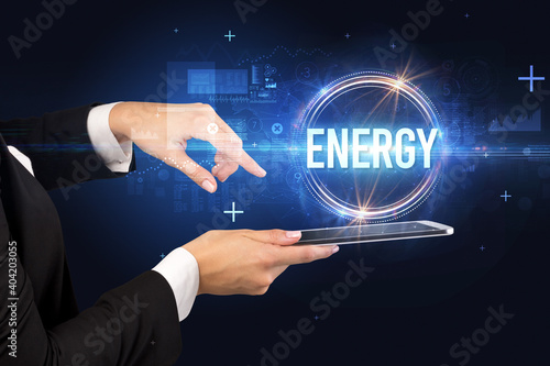 Close-up of a touchscreen with ENERGY inscription, new technology concept