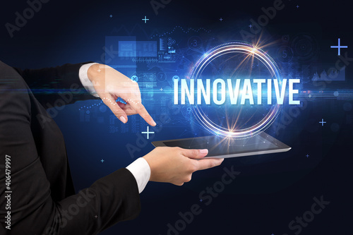 Close-up of a touchscreen with INNOVATIVE inscription, new technology concept