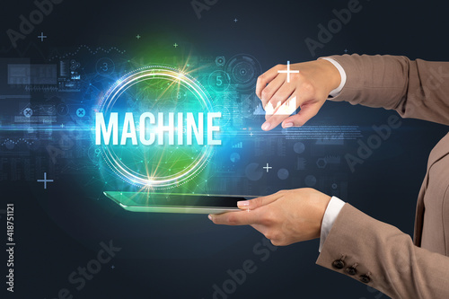 Close-up of a touchscreen with MACHINE inscription, new technology concept