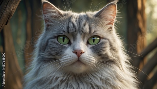 Close-up of a tranquil gray and white domestic cat with green eyes and expressive features
