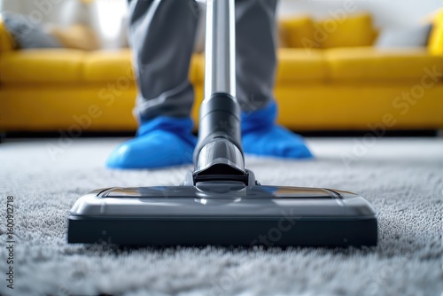 Close-up of a vacuum cleaner cleaning a carpet in a modern living room.
