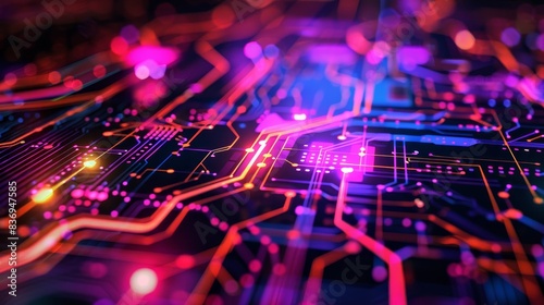 Close-up of a vibrant and futuristic circuit board with glowing lines and nodes, representing advanced technology and digital connectivity.