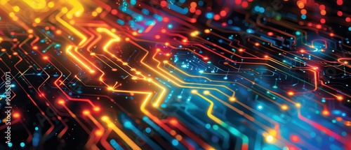 Close-up of a vibrant, colorful circuit board with illuminated pathways and connections, representing technology and innovation.