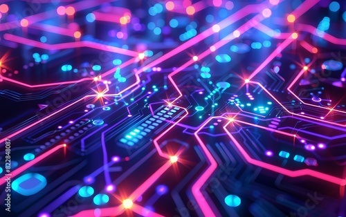 Close-up of a vibrant, futuristic circuit board with glowing lines and neon lights, representing advanced technology and innovation.