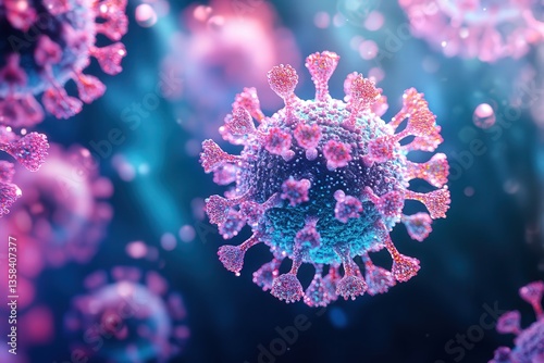 Close-up of a vibrant, magnified virus particle in a colorful background.
