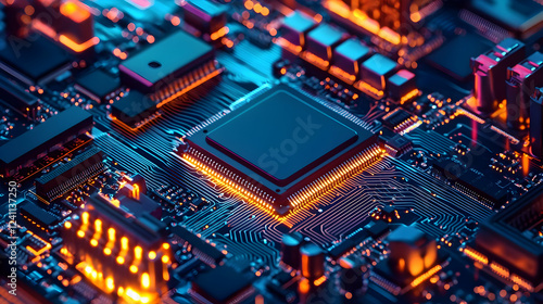 Close-up of a vibrant microchip with glowing circuitry on a circuit board
