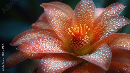 Close-up of a vibrant orange flower adorned with dew drops, showcasing its delicate petals and intricate details in a lush environment. Generative AI