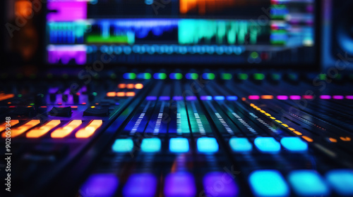 Close-up of a vibrant sound mixing console in a recording studio with colorful LED lights and audio waveforms on a screen.