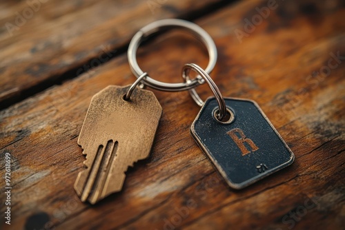 Close-up of a vintage key and tag on a wooden surface, representing security and access to personal spaces.