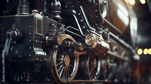 Close-up of a vintage steam locomotive's metal wheels and mechanical components, showcasing intricate details in an industrial setting.