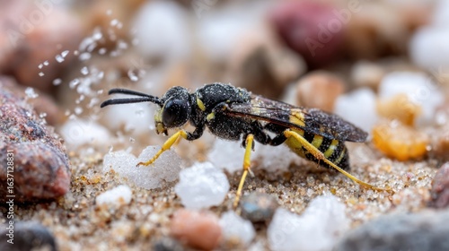 Close-up of a wasp-like insect on gravel, surrounded by small, white granules