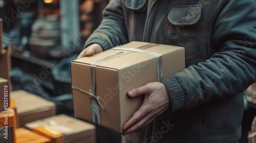 Close-up of a white man’s hands placing a box on top of other boxes in a house garage, illustrating moving, organizing, and home improvement tasks in a domestic setting with storage and unpacking.